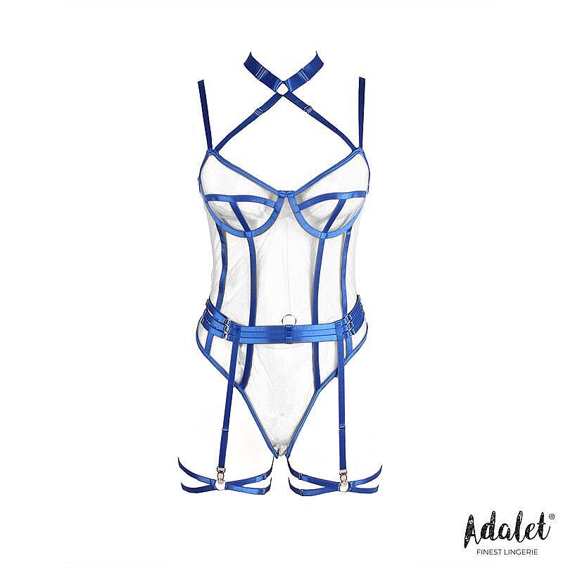 Průsvitné síťované body v modré barvě s nastavitelnými ramínky, podvazky a kroužky na nohy. Zvýrazní křivky, podpoří sebevědomí a dodá outfitu smyslný, provokativní vzhled.