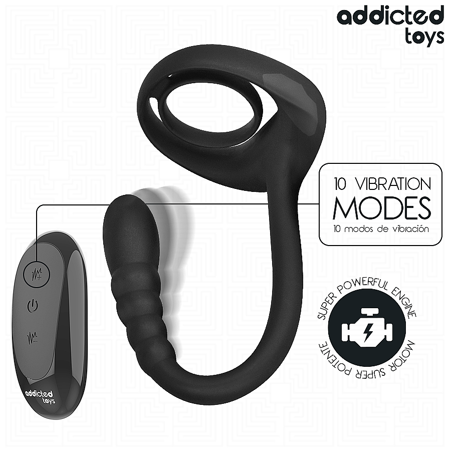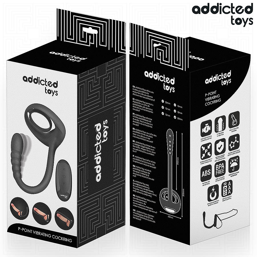 Addicted Toys P-Spot Vibrating Cock Ring v černé barvě s dvěma supervýkonnými motory současně hladí penis i P-bod (prostata) a posílá tělem bouřlivé vibrace. Jeho zahnutý a pružný design se lehce přizpůsobí, aby zasáhl ty nejcitlivější zóny bez kompromisů. 10 vibračních režimů nabídne jemné pulzy i dynamické rytmy – přesně podle vaší nálady. Bezdrátové dálkové ovládání promění hru v napínavé škádlení, ať už si tempo řídíte sami, nebo je svěříte partnerovi. Lékařský silikon v kombinaci s ABS je sametově hebký, bezpečný pro tělo a bez ftalátů, takže si užijete měkké klouzání i pohodlné nasazení. Vodotěsné provedení zve do sprchy či vany a magnetické nabíjení udržuje kroužek vždy připravený. Promyšlené rozměry (délka 21,5 cm, zasunutelná 19,5 cm, šířka 6,8 cm) zaručí ergonomické padnutí a přesnou stimulaci tam, kde ji chcete.