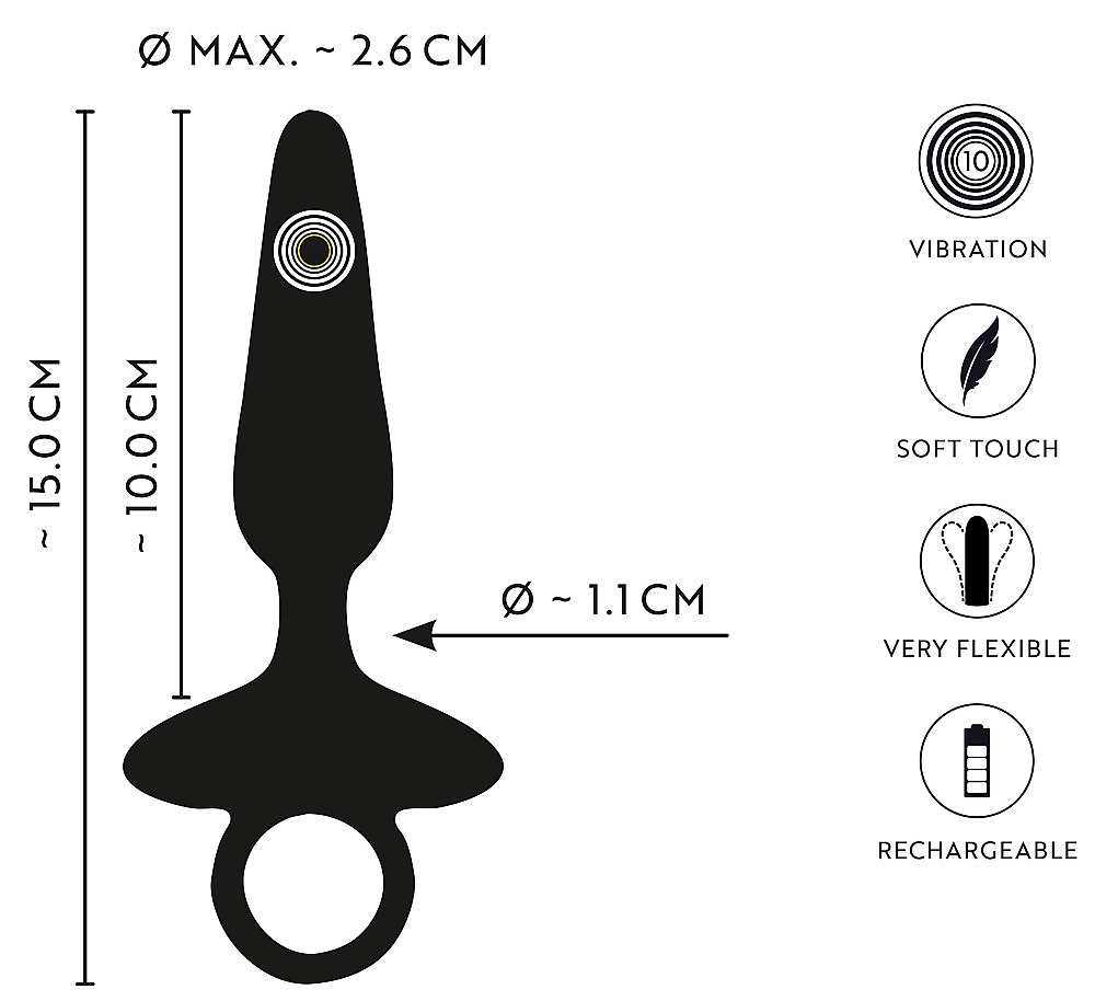 ANOS Flexible Butt Plug With Vibrations hladce vklouzne díky štíhlému kuželovitému tvaru a sametově hebkému silikonu, který se příjemně podvolí každému pohybu. Jeho flexibilní tělo se přizpůsobí vašemu rytmu a poskytne hravou, přitom bezpečnou stimulaci. Široký stopér s praktickým kroužkem hlídá, aby nepokročil příliš hluboko, a zároveň dovolí rychlé a pohodlné vytažení, když touha nabere spád. Výkonný, ale tichý motor nabídne 10 intenzivních režimů vibrací – od něžného bzučení po pulzující vlny – a snadné ovládání jediným tlačítkem vás nechá přepínat mezi prožitky s rošťáckou lehkostí. Nabíjecí provedení s přiloženým USB kabelem udrží váš kolík připravený na další jízdu, kdykoli si řeknete. S celkovou délkou 15 cm, zasunutelnou délkou 10 cm a maximálním průměrem 2,6 cm je jako stvořený pro začátečníky i zvědavé páry, které si chtějí užít pestrou anální zábavu. Lehkých 81 g zajistí pohodlné nošení a dlouhotrvající potěšení bez únavy.