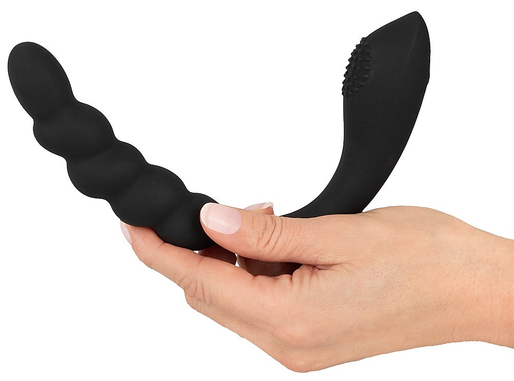 Black Velvets Bendable Dual Stimulator spojuje kuličkový vibrátor a přiložný (lay-on) vibrátor do jednoho nápaditě ohebného těla, které se mazlivě přitulí k tvému tělu. Je vysoce flexibilní, takže umožňuje současnou vnitřní i vnější stimulaci a hravě se postará o vaginální i anální potěšení. Každý konec vibruje intenzivně, protože uvnitř pracují dva tiché a výkonné motory – jeden pro každou stranu – a na každém konci máš k dispozici 10 pestrých vibračních režimů. Ovládání je snadné jediným tlačítkem umístěným na přiložné části, takže se můžeš plně soustředit na rozkoš. Díky vodotěsnému provedení si užiješ ve sprše i ve vaně. Sametově hebký silikon s PU úpravou klouže jemně po kůži a vytváří hedvábný dotek, který tě bude znova a znova lákat. Kuličkový konec se snadno zavádí a přiložný konec můžeš přesně polohovat dle chuti. Vibrující měkké tečky něžně hýčkají klitoris nebo varlata pro extra šimravé vyvrcholení. Je dobíjecí a připravený kdykoli – USB kabel je součástí balení. Celková délka je 26 cm; kuličkový vibrátor má zaváděcí délku až 16 cm a max. Ø 2,8 cm, přiložná část má Ø 3,3 cm. Váha 150 g. Černá barva vypadá luxusně a svůdně.