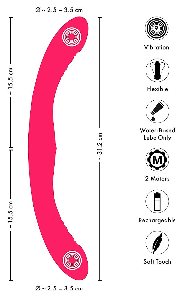 Couples Choice Double Vibrator z hebkého silikonu hladce klouže a láká k nekonečným hrátkám. Couples Choice Double Vibrator má dvě šikovně tvarované špičky se stylizovanými žaludy, které se snadno vkládají a svůdně masírují každý citlivý centimetr. Jeho flexibilní tělo se přizpůsobí vašemu tempu i poloze – skvěle funguje mezi dvěma těly a láká na polohu na pejska i hravý krabí styl. Dva výkonné motory rozvibrují obě strany současně a přinesou sdílenou, intenzivní extázi. Devět vibračních režimů promění každý dotek v jinou melodii slasti, zatímco jemné drážky a vlnky přidají extra vlnu stimulace. Ovládání jediným tlačítkem uprostřed je nesmírně snadné – stačí stisk a rozkoš se rozběhne. Dobíjecí přes USB, takže jste vždy připraveni. Celková délka 31,2 cm nabízí velkorysý prostor pro fantazii, vkládací délka 15,5 cm na každé straně slibuje plné zaplnění, průměr 2,5–3,5 cm hýčká i naplňuje. Růžová barva přidává něžnou jiskru a hmotnost 280 g dodává příjemnou jistotu v ruce. Se sametově hebkým povrchem a hravou povahou je to erotická hračka, která vás donutí vracet se pro další kolo.