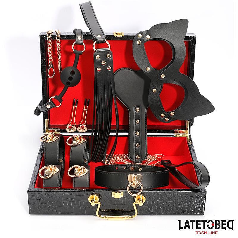 LATETOBED BDSM LINE 8 Piece Leather Bondage Kit with Storage Case od značky LATETOBED je komplexní kožená BDSM sada, která potěší začátečníky i zkušenější milovníky mocenských her. Nabízí osm základních pomůcek pro pestré scénáře svazování, disciplíny a roleplay. Kožené zpracování působí smyslně, pevně a vizuálně luxusně, zatímco zlaté detaily dodávají celé sadě elegantní, výrazně erotický charakter. V balení najdete pouta na ruce pro bezpečné omezení pohybu, pouta na kotníky pro ještě intenzivnější kontrolu, kočičí masku pro svůdné hraní rolí i prohloubení anonymity, prodyšný roubík s nastavitelným upínáním pro pohodlnější nošení, důtky pro dráždivou stimulaci, svorky na bradavky pro zkoumání citlivých zón, plácačku ve tvaru srdce pro vášnivé výprasky a obojek s vodítkem pro podmanivé vedení partnera. Velkou výhodou je také praktický úložný kufřík se hadím vzorem, díky kterému zůstane celá sada přehledně uložená a připravená na další hrátky.