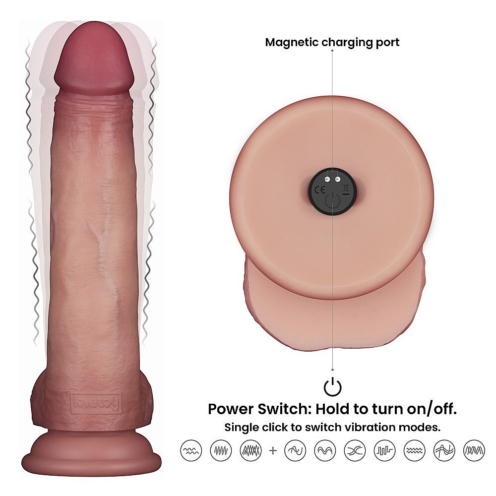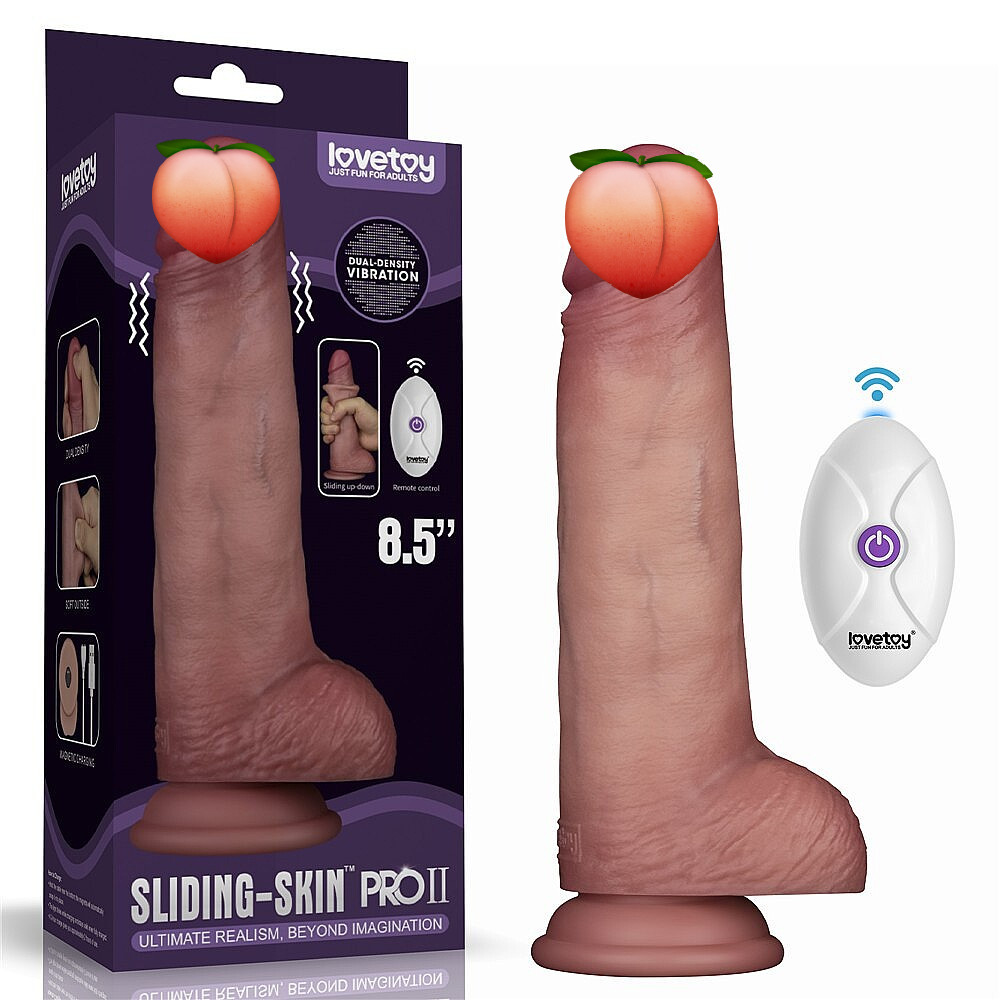 Lovetoy Sliding Skin Pro II 8,5" Vibrating Silicone Dong od značky Lovetoy posouvá realistický prožitek na vyšší úroveň díky moderní technologii sliding-skin. Vylepšený povrch z jemného lékařského silikonu působí hebce, komfortně a velmi věrohodně. Dvouvrstvá konstrukce s měkkým vnějším pláštěm a pevnějším vnitřním jádrem napodobuje pocit ztopořeného penisu a přináší přesvědčivě autentickou stimulaci. Hračka nabízí 10 vibračních režimů, takže si snadno přizpůsobíte tempo i intenzitu svým chutím. Ovládání je pohodlné díky bezdrátovému dálkovému ovladači, který dodává více volnosti při sólových i partnerských hrátkách. USB dobíjení zajišťuje praktické a opakované používání bez starostí s výměnou baterií. Realistický tvar a propracovaná textura v kombinaci s jemným povrchem vytvářejí hravou, erotickou a velmi smyslnou zkušenost. Pro ještě hladší a příjemnější klouzání je ideální použít lubrikant na vodní bázi.