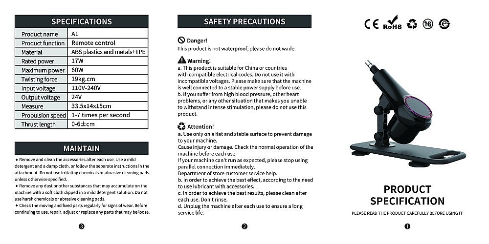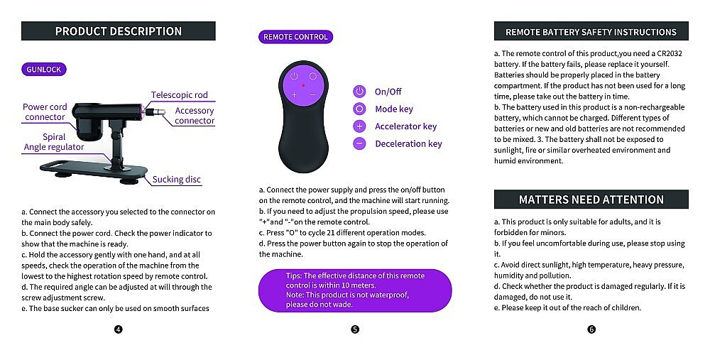 Mistress Sex Machine A1 je stvořena pro hravé experimenty a intenzivní potěšení. Je vyrobena z kvalitních materiálů, aby vydržela dlouhé noci i náročné tempo – pevná konstrukce z ABS a kovů drží rytmus, když chcete přidat na tempu. Bezdrátový ovladač s dosahem 10 m vám dává svobodu dirigovat akci na dálku; jedním stiskem „+“ zrychlíte, „-“ zvolníte a tlačítkem „O“ si přepínáte mezi 21 vzrušujícími režimy, které pošimrají, rozdráždí a nakonec rozjedou divokou jízdu. Přírazy 1–7× za sekundu se postarají o jemné vlnění i pulzující bouři, zatímco zdvih až 6 cm připraví lahodné naplnění přesně tam, kde ho chcete. Mistress Sex Machine A1 stojí pevně díky dvěma silným přísavkám, které se zakousnou do hladkého povrchu, takže se můžete vrhnout do rytmu bez starostí. Nastavitelný úhel – horizontálně i vertikálně – vám dovolí hledat ten správný bod potěšení a měnit polohy s hravou lehkostí. Napájení kabelem drží výkon stabilní a nepolevující, připravený na dlouhé session. Po hře stačí teplá voda se saponátem a čistič hraček, trocha lubrikantu na vodní bázi a jste připraveni na další kolo. Dildo, vyrobené z hladkého TPE, je součástí balení.