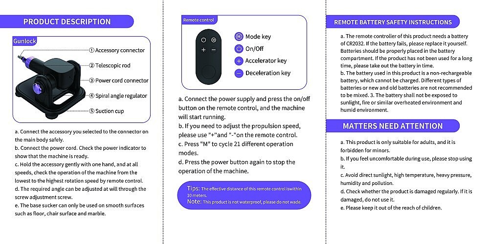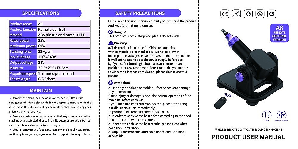 Mistress Sex Machine A8 si bere slovo, když chcete víc než jen jemné chvění. Je vyzbrojena 21 frekvencemi vibrací, které si s vaším tělem hrají od jemného vrnění po pulzující extázi. Bezdrátový ovladač s dosahem 10 m vám dává moc ovládat vše z pohodlí postele či ze stínu místnosti, zatímco drobná baterie CR2032 drží vše při životě. Nastavitelný vertikální úhel vám umožní trefit přesně to místo, které toužíte dobývat, a přírazy 1–7× za sekundu se postarají o tempo od pomalé masáže až po neúnavný maraton. S délkou přírazu až 5,5 cm postupně buduje vlny napětí – tak akorát na to, aby chuť jen rostla. Základna se 4 přísavkami přilne k hladkým povrchům a drží jako milenec, který se vás nechce pustit. Vášnivou hru doplní vibrace a ohřev, které rozehřívají tělo i fantazii do slastného varu. Tělo z ABS, kovu a TPE je pevné, stabilní a přitom příjemné na dotek. Snadné připojení přes adaptér znamená méně starostí a více potěšení. V balení najdete podrobný návod, protože i touhu je fajn mít pod kontrolou. Není vodotěsný, ale o to víc si rozumí s vaší ložnicí. A až bude po všem, stačí omýt vlažnou vodou se správným čističem a použít lubrikant na vodní bázi pro další kolo bez zaváhání.
