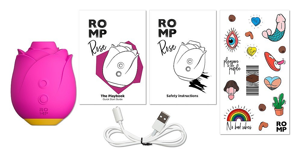 ROMP Rose je další z řady zázračných tlakových stimulátorů. Zobáček hračky klitoris lehce nasaje a poté ho stimuluje pomocí podtlakových vln. Můžete měnit intenzitu mezi 6 úrovněmi intenzity a ještě můžete měnit mezi 4 různými módy, kde se různě mění intenzita. Hračka má dokonalý ergonomický tvar, je lehký, takže se s ní lehce manipuluje a je velice tichý. Stimulátor je navíc vodotěsný (IPX7), proto si ho vemte do koupelny pro hrátky ve sprše nebo třeba i vaně. Dál můžete zapnout cestovní zámek, který preventuje hračce, aby se zapla, zatímco ji máte například v kufru. USB dobíjecí magnetický kabel je součástí balení a po plném nabití, které trva cca 60 minut, si můžete se svojí růžičkou užívat cca 65 minut.