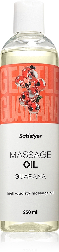 Satisfyer Massage Oil 250 ml (Guarana) je požitkem, který rozproudí energii a probudí fantazii. Silná a přitom hebká vůně guarany s tóny pražené kávy vás rozvášní a přidá špetku svůdné hořkosladkosti jemné čokolády, zatímco vanilkový nádech pohladí smysly do úplného uvolnění. Jeho hedvábná textura klouže jako samet, hýčká křivky a zve prsty k delším, hravým dotekům. Vyživující rostlinné oleje zanechají pokožku měkkou a pružnou, aby se každé pohlazení stalo pozvánkou k dalšímu kolu. Energizující efekt vdechne masáži pulzující tempo a po dlouhém dni obnoví chuť na jemné i odvážnější hry. Neutrální, jemná formule je mnohostranná – dopřeje partnerským masážím zábavný spád a při self-care promění koupelnu v soukromé spa. Stačí malé množství do dlaní, jemně vmasírovat a nechat, ať se okamžitě rozvine jeho pečující kouzlo; když budete chtít víc, jednoduše přidejte další kapky. Podpisová vůně Jižní Ameriky dá každému doteku exotický přízvuk a připomene, že kůži si zasloužíte hýčkat stejně jako touhy.
