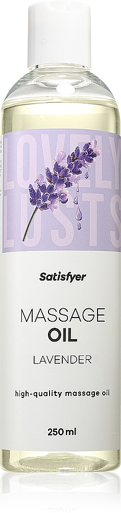 Satisfyer Massage Oil 250 ml (Lavender) svůdně klouže po pokožce a dopřeje jí dlouhotrvající péči. Jeho hedvábná textura vytváří sametový film, který se pomalu vstřebává, takže si můžete vychutnat dlouhé a plynulé tahy. Nemastné zakončení zanechá kůži hladkou, ne ulepenou. Vůně levandule jemně uvolňuje napětí a harmonizuje smysly – ideální pro párové masáže, něžné doteky i intimní rituály. Pečující mix rostlinných olejů (slunečnicový, sójový, jojobový) vyživuje a zvláčňuje, zatímco tocopherol (vitamin E) podporuje hebkost pokožky. Díky jemné, neutrální formuli si ho můžete přidat kdykoli – stačí pár kapek do dlaní nebo přímo na tělo a fantazii se meze nekladou. Satisfyer spojuje relaxaci a erotiku do dokonale voňavé harmonie, která zve k blízkosti a hravým dotekům.