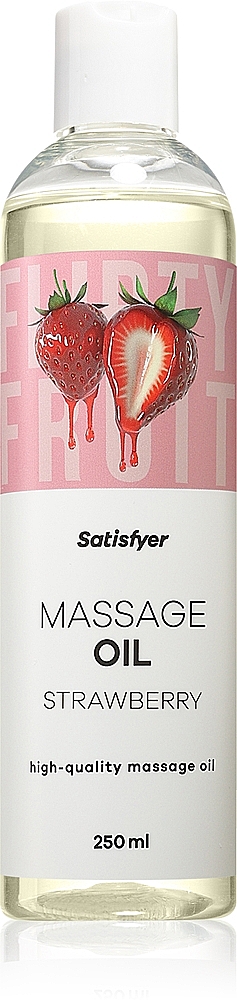 Satisfyer Massage Oil 250 ml (Strawberry) svádí šťavnatou vůní čerstvých jahod a promění každou masáž v hravou, vzrušující a něžně provokativní hru. Satisfyer Massage Oil 250 ml (Strawberry) se rozprostírá jako jemný závoj, klouže po kůži s neuvěřitelnou lehkostí a zanechává ji hladkou, hebkou a toužící po dalších dotecích. Jeho hedvábná textura se vstřebává bez nepříjemné mastnoty, takže se můžete oddávat nekonečnému mazlení bez kompromisů. Fruity aroma jahody povzbudí, naladí a dodá vašim rituálům nádech sladkého pokušení. Vyživující směs rostlinných olejů (slunečnicový, sójový a jojobový) hýčká pokožku intenzivní péčí a hydratací. Neutrální, jemné složení rozvazuje fantazii – hodí se pro něžné pohlazení i hravou předehru. Jednoduchá aplikace umožní nanést malé množství a plynule přidávat kdykoli budete chtít prohloubit slast. Bez lepivosti a s dokonalou kluzností pro dlouhé masáže plné napětí a uvolnění. Objem 250 ml zajistí spoustu společných chvil a připravenost pro každý spontánní dotek.