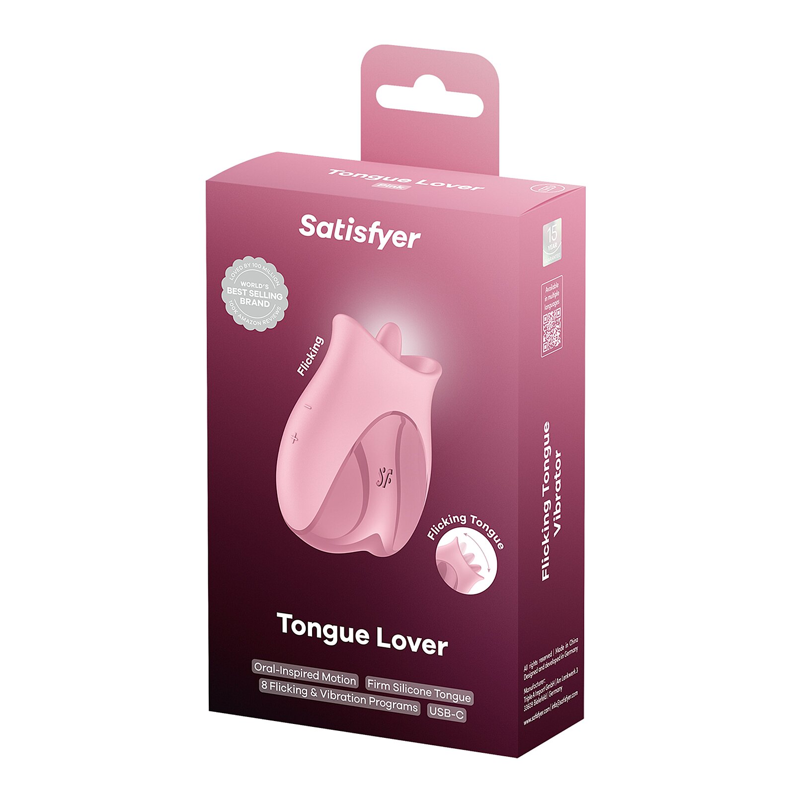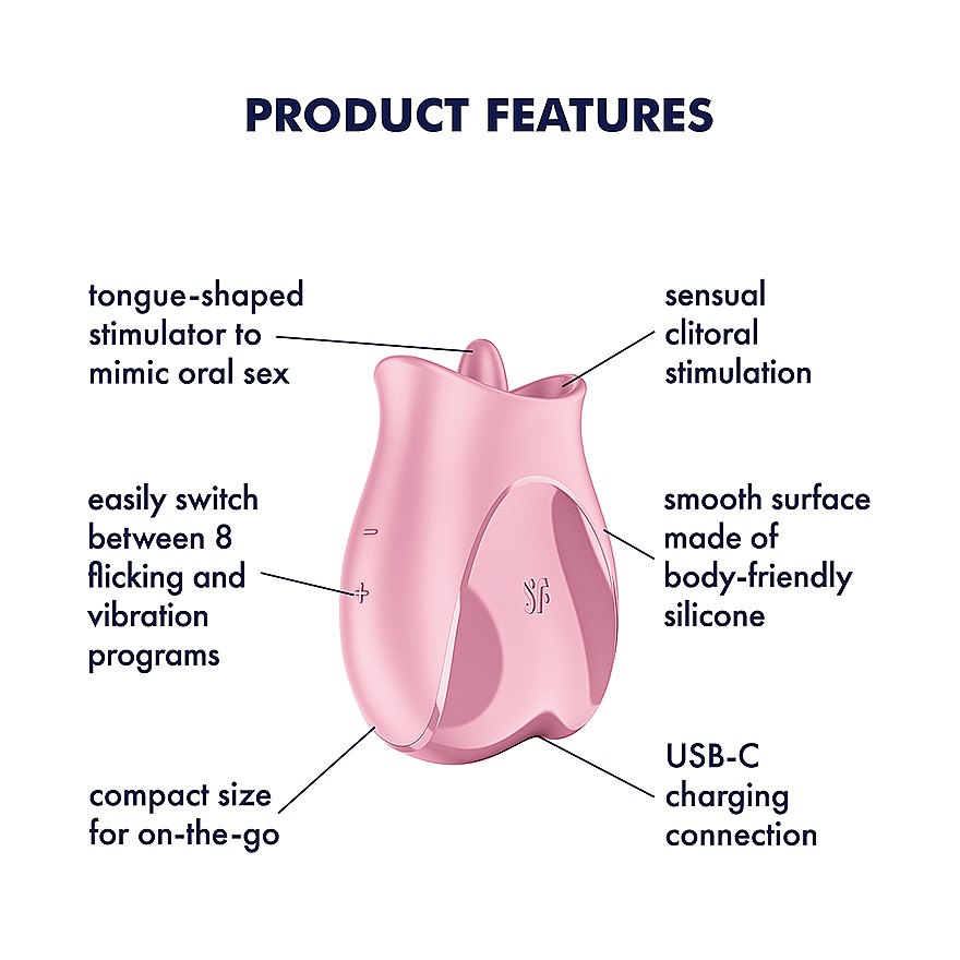 Satisfyer Tongue Lover se opře do hry pevnou silikonovou špičkou, která věrně napodobuje živé lízání a přesně zacílí tam, kde to máte nejraději. Jeho ultra hebký silikon předává silné vibrace intenzivně a sametově něžně, zatímco 8 jazýčkových pohybů a 8 vibračních programů lehce střídá pomalé škádlení i rychlý útok na extázi. Klitorální stimulace je přesná a beze sklouznutí – ergonomický tvar s drážkou pro úchop sedne do ruky jako ulitý a nechá vás soustředit se jen na rozkoš. Whisper mode drží vaše tajemství v bezpečí, i když vibrace běží naplno. Díky voděodolnosti IPX7 si užijete ve sprše i ve vaně a čištění je hračka. Nabíjení přes USB‑C a integrovaná lithium‑iontová baterie se postarají, že je tahle kompaktní hračka vždy připravená, ať už sólo, nebo s partnerem.