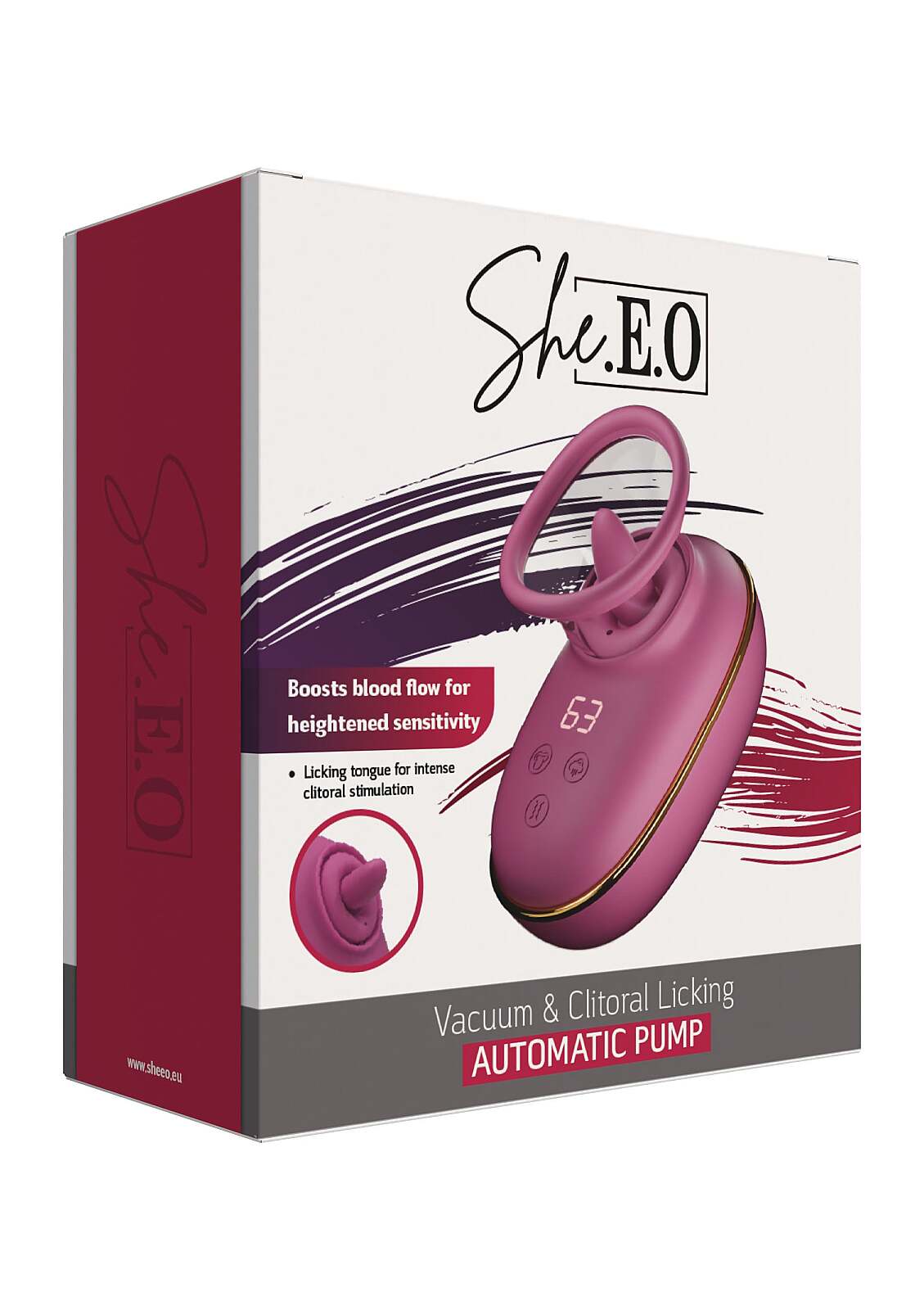 She.E.O představuje Licking Clitoral Automatic Pump, která kombinuje vakuum, lízání a vibrace pro intenzivní stimulaci. Měkký rotující jazýček něžně masíruje klitoris či bradavky a jeho pohyb vás rozvibruje do hloubky. Vakuový kalíšek zvyšuje prokrvení a citlivost, takže každé doteky chutnají ještě více. 9 režimů vibrací a 9 rotací umožní přesně zvolit tempo, které vás rozpálí, zatímco 3 úrovně sání přidají smyslný tlak. Jazýček můžete použít i bez kalíšku – v tomto režimu sahá hlouběji a dráždí intenzivněji. Tělo z lékařského silikonu a ABS je hebké a bezpečné pro tělo. Ergonomický tvar perfektně padne do ruky a usnadní přesné míření slasti. Nabíjení přes USB a baterie Li‑ion poskytují až 65 minut potěšení po 150 minutách nabíjení. Díky IPX6 voděodolnosti si užijete i ve sprše. Kompaktní 11 cm délka a hmotnost 285 g dělají z hračky ideálního společníka doma i na cestách.