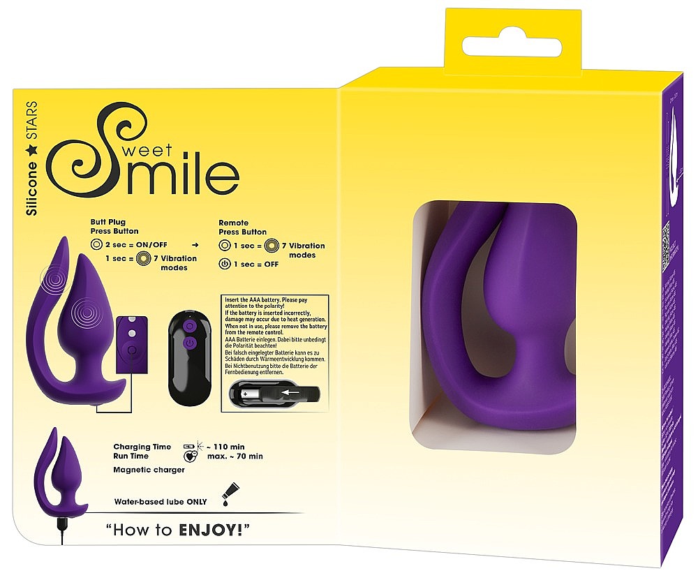 Sweet Smile RC 2 In 1 Plug & Panty Vibe je šelma na potěšení, co se ráda schovává v kalhotkách a vyplňuje vás přesně tam, kde to milujete. Silikonový plug s úzkou špičkou klouže vaginálně i análně jako sen a jeho tichá síla vás bude rozpouštět. Přikládací část se pružně přitulí k vulvě a klitorisu nebo hravě zašimrá hráz – zároveň uvnitř i venku, pro sofistikovanou dualní stimulaci. Dva tiché, ale výkonné motory vibrují v 7 rozmanitých režimech, které přepnete buď přímo na těle hračky, nebo se o to postará partner s dálkovým ovladačem s dosahem až 8 metrů. Vodotěsné provedení vám dovolí rozpustilé hrátky ve sprše i ve vaně. Tělo z hedvábně jemného silikonu se podvolí vašim křivkám a pohybům a je zcela bezpečné i pro anální použití. Nabíjecí akumulátor zvládne dlouhé večery a USB kabel je připraven v balení. Ovladač si řekne o 1× AAA baterii, kterou přidejte zvlášť. S Sweet Smile RC 2 In 1 Plug & Panty Vibe se tajné laškování změní na smyslný rituál – doma, venku i na cestách.